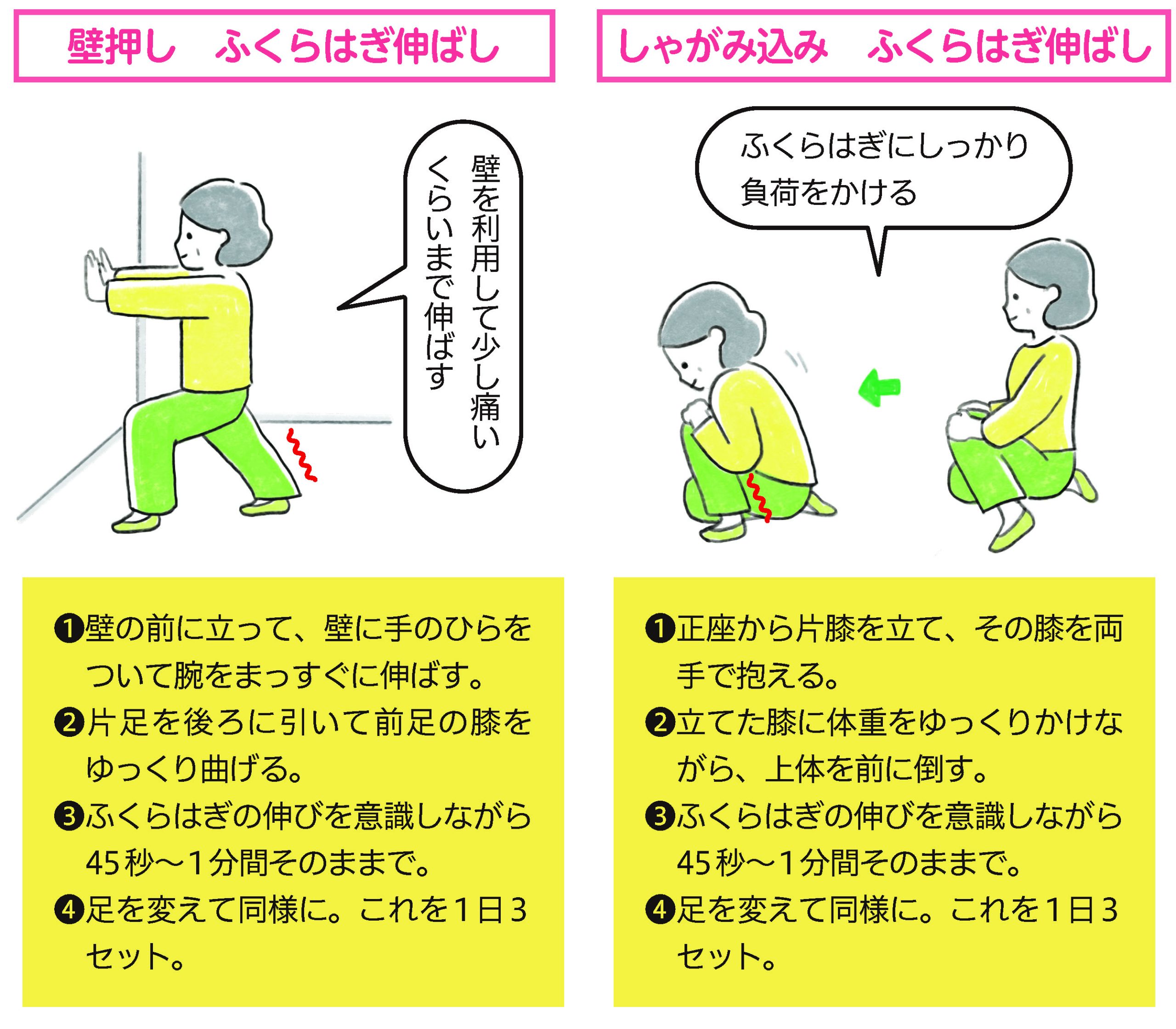 症状の改善や予防には、まず「ふくらはぎ伸ばし」から