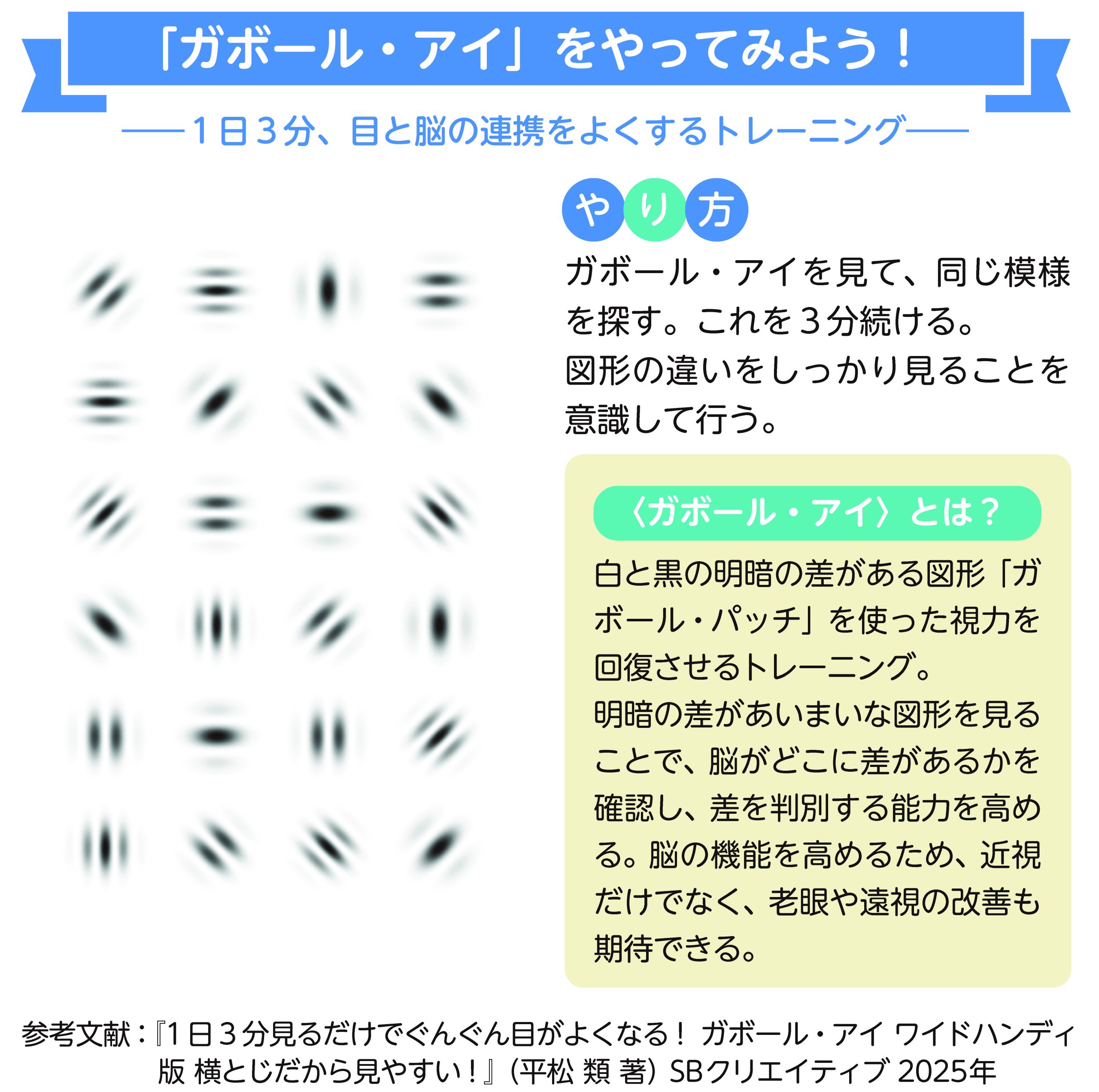 目と脳の連携をよくして視力を回復させるトレーニングに、「ガボール・アイ」があります。1日3分眺めるだけで脳の処理能力が上がり、視力の回復が見込まれます。また、あえて+2程度の老眼鏡をかけて遠くを見る方法もあります。目のピントを合わせずボヤッとした状態で見ることで、目の緊張をほどき、視力低下を予防する効果があるのです。